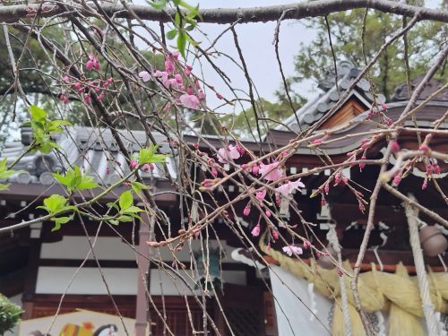 4月 月次祭 2026年4月1日 本日午前8時より卯月の月次祭を斎行いたしました。 月次祭を終えてから間もなく雨が降り、その後も断続的に雨が止まない一日でした。 昨日は暑いくらいの陽気の後、春の嵐で荒れた天気となりました。 強い風に吹かれても、このあたりの桜は咲き始めたばかりで、まだそれほど散ることは無かったように思います。 当神社の拝殿前の枝垂桜は、10~20輪ほど花が咲いているのを確認できました。 これからは、ひと雨ごとに春が進んでいくといった感じでしょうか。