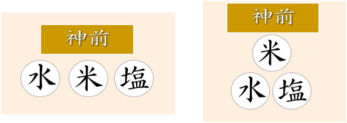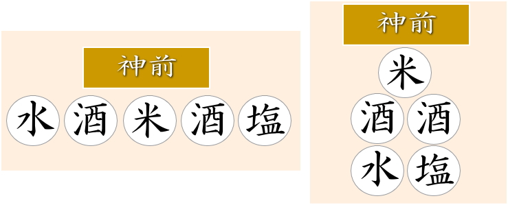 神様へのお供え物を神饌(しんせん)と言いますが、神饌は通常は、米・酒・塩・水です。毎朝これらの神饌をお供えし、夕方にお下げします。これらをお供えする場合にもそれぞれに順番があり、その順番は以下になります。(基本的な神饌の並べ方は横一列ですが、スペースの都合で二列に並べても結構です)