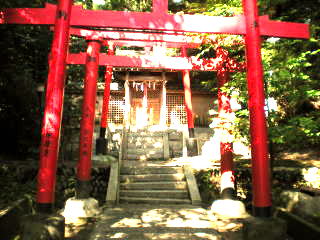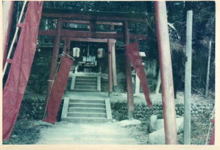 赤い鳥居は当時のものは現在残っていません。現在では鳥居の脇にブロックが置かれ、参道もコンクリートで整備されています。手前の石段は現在は左に少し沈んでしまっています。