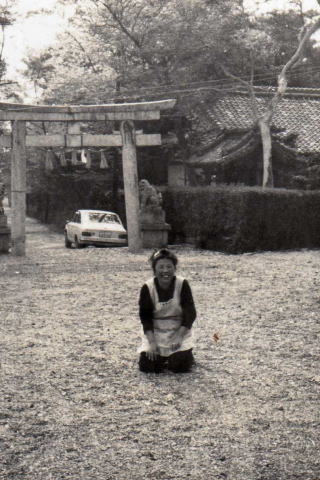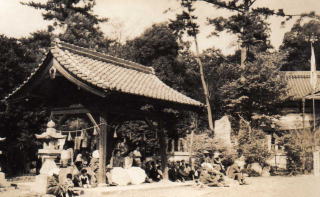 手水舎と拝殿(右奥)の間には昔 松が植えられていましたが、今はありません。手水舎の右手にある忠魂碑(白く写っている石)が当時ははっきり見えていましたが、今は植木で隠れてしまっています。手水舎や燈篭は、ほとんど当時と変わりはありません。