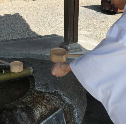 ① まず右手でひしゃくを取り、水をすくい“ 左手 ”を清めます